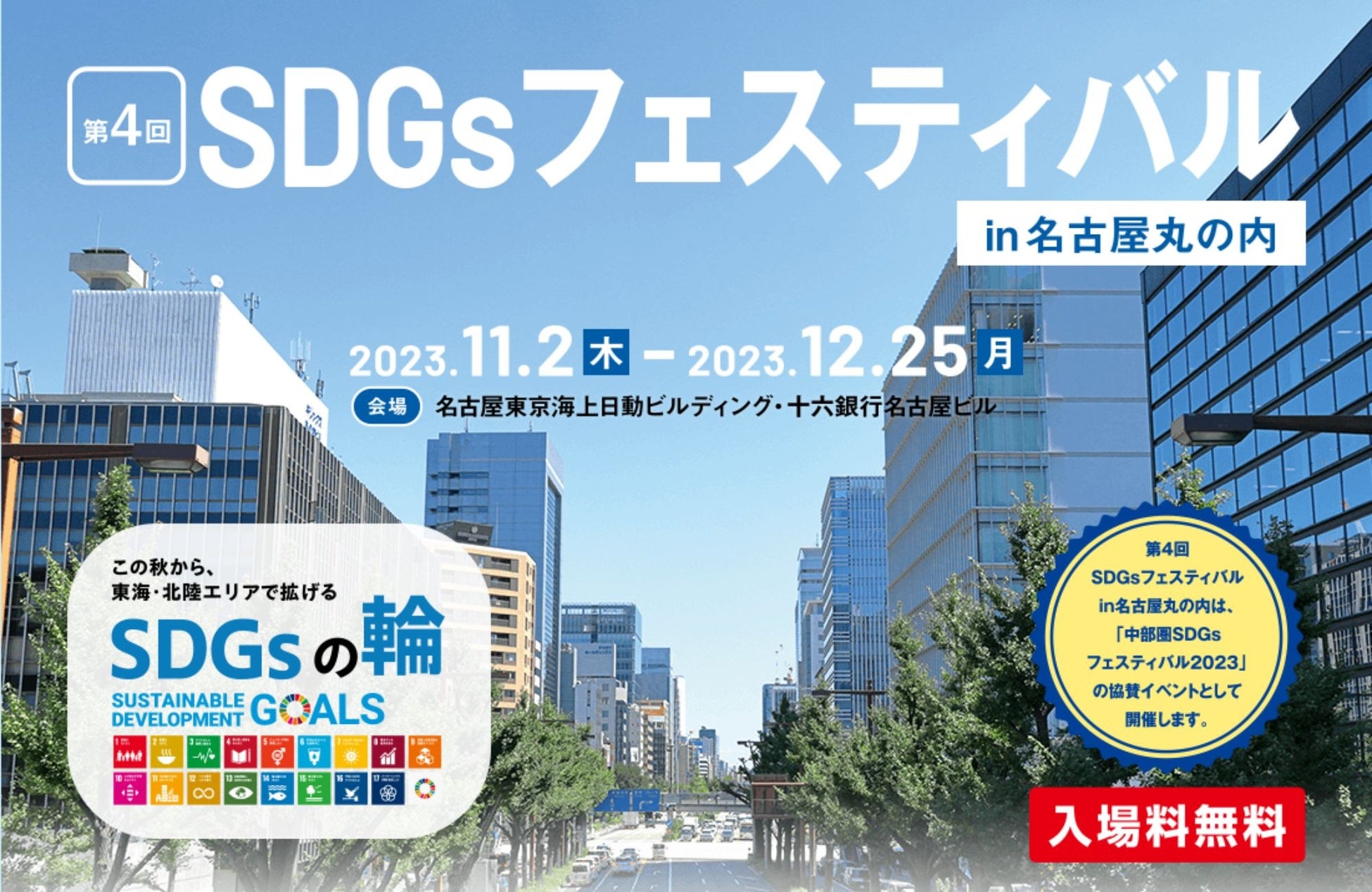 11月2日(木)~12月25日(月)の期間において、名古屋東京海上日動ビルディング・十六銀行名古屋ビルで開催されます。さらに、本フェスティバルの初日である11月2日(木)にはオープニングイベントが開催され、55以上の出展者のブース展示や物産展が行われる「SDGsまつり」の他、生物多様性の保全やサーキュラーエコノミーについてディスカッションする「SDGsシンポジウム」や「SDGs交流会&相談会」が開催されます。