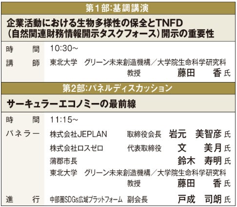 企業活動における生物多様性の保全の重要性とTNFD(自然関連財務情報開示タスクフォース)の動きを理解いただく基調講演とともに、生物多様性の保全の原動力となるサーキュラーエコノミーに取り組む企業の経営者等をお招きして具体的な取り組みを理解いただくパネルディスカッションを開催します。