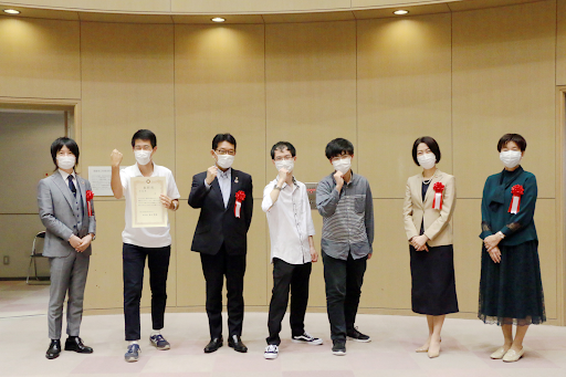(写真:2021年「豊中市SDGsまちづくり政策コンテスト」にて、市長賞を受賞した「まちかねクロコダイルず」と審査員)